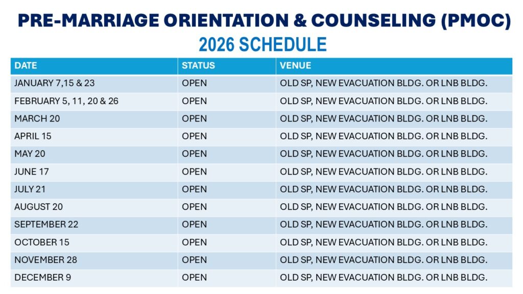 The conduct of Responsible Parenthood and Family Planning Session among parents and engaged couples applying for marriage. The session aims to assist them realize their desired number, timing and spacing of their children. Likewise, parents and engaged couples be enlightened as to their needs towards building a happy, healthy and empowered Filipino families.